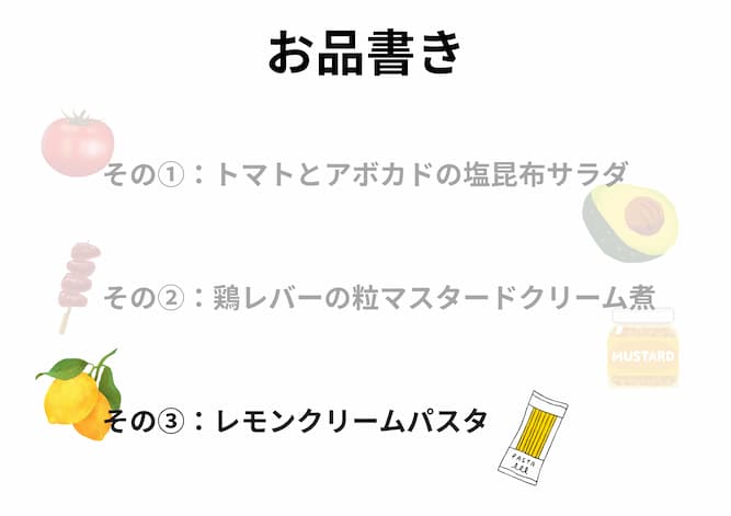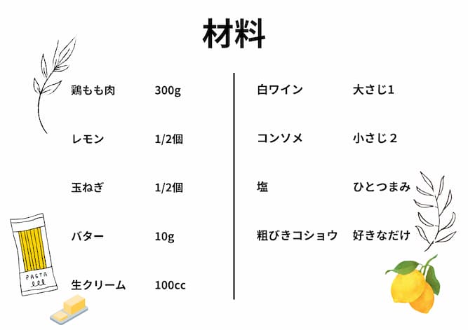第1回は「前菜」・第2回は「副菜」でしたが第3回はついに「主菜」 レモンクリームパスタです。